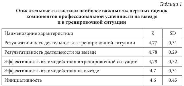 1) средняя оценка результативности, качества, безошибочности деятельности на выезде и в тренировочной ситуации, 2) средняя оценка эффективности взаимодействия на выезде и в тренировочной ситуации, 3) средняя оценка инициативности профессиональной деятельности, а также удовлетворенность трудом.