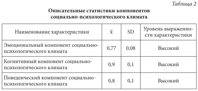 Личностная надежность определяется многочисленными качествами, обладающими высокой интери интраиндивидуальной вариативностью, однако показатели социально-психологического климата имеют определенное социально-желательное значение. Средние баллы трех компонентов социально-психологического климата (табл. 2) находятся в диапазоне высоких значений, однако эмоциональный компонент занимает из всех самое низкое положение (–x = 0,77; SD = 0,08), среднее — поведенческий компонент (–x = 0,77; SD = 0,08), а высокое — когнитивный компонент (–x = 0,8; SD = 0,1). В целом можно сделать вывод, что в коллективе преобладает атмосфера взаимопомощи и уважения, желание работать с коллегами, а также дружеские отношения между сотрудниками, что очень важно для работы в команде.