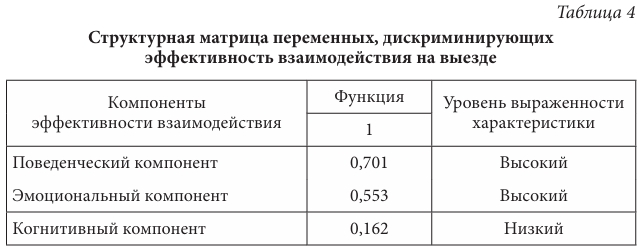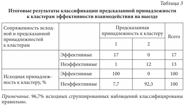 Мы предположили сложную структуру связей между этими характеристиками, поэтому воспользовались двухэтапным кластерным анализом (учитывались экспертные оценки эффективности во взаимодействии и компоненты социально-психологического климата) с дальнейшим уточнением ключевых различий полученных кластеров средствами пошагового дискриминантного анализа. На основании кластерного анализа было выделено две группы спасателей, которые, как выяснилось, разделились практически по критерию эффективности во взаимодействии (по экспертной оценке), поэтому мы назвали их «эффективные…» и «неэффективные во взаимодействии». Для выявления дальнейших различий между кластерами был использован пошаговый дискриминантный анализ, где в качестве зависимой переменной выступала принадлежность к кластеру. Независимые переменные были представлены экспертными оценками эффективности взаимодействия на выезде и характеристиками социально-психологического климата. Дискриминантный анализ выявил одну статистически значимую каноническую функцию — эффективность (Лямбда Уилкса = 0,317 при уровне значимости ≤ 0,001) с оценкой предсказанных значений сгруппированных наблюдений 96,7% (табл. 3).