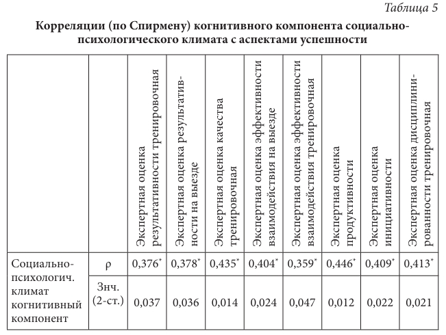 Эффективность взаимодействия на выезде и на тренировке требует от специалистов высокого уровня эмоционального (ρ = 0,452; знч. = 0,011) и когнитивного (табл. 5) компонентов социально-психологического климата, а на тренировке — эмоционального (ρ = 0,390; знч. = 0,030), когнитивного (табл. 5), и поведенческого (ρ = 0,416; знч. = 0,020), на выезде требуется сниженный уровень экстрапунитивных реакций с фиксацией на самозащите (когда нежелательна склонность обвинять окружение в своих неудачах, которая возникает из-за желания защитить себя) (ρ = –0,357; знч. = 0,049), что вполне логично — на выезде команда должна действовать слаженно, несмотря на проблемы в личных взаимоотношениях.