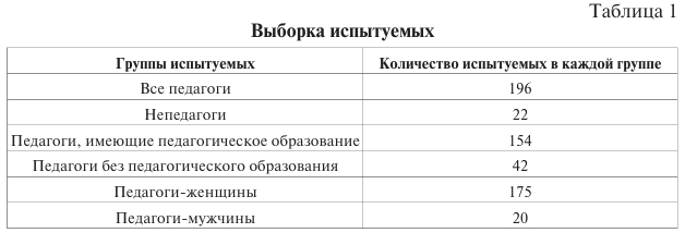 В качестве испытуемых в нашем эксперименте участвовали учителя средних школ, имеющие и не имеющие специальное педагогическое образование, а также непедагоги. Всего — 218 человек. В таблице 1 указаны исследуемые группы и количество испытуемых в каждой группе.