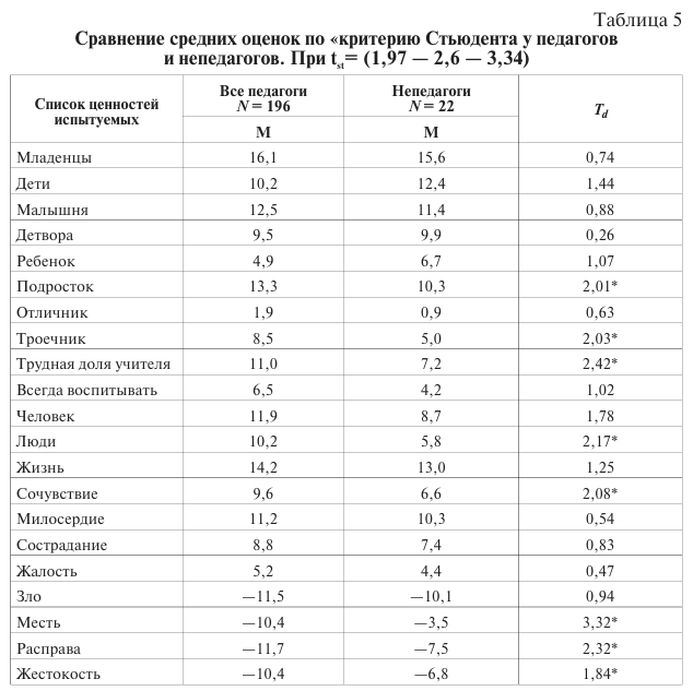 В той же таблице 5 можно отметить, что занимающиеся педагогической деятельностью отличаются от непедагогов по трём из восьми нравственных категорий: первые более положительно оценивают такую черту, как «сочувствие», а также более негативно, чем непедагоги, оценивают такие черты, как «месть» и склонность к расправе. На характер пяти остальных нравственных установок фактор «педагогическая деятельность» достоверно не повлиял: и те, кто занимается педагогической деятельностью, и те, кто ею не занимается, одинаково оценивают и «милосердие», и «жестокость», и другие категории.