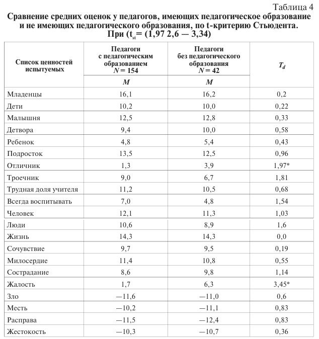 Кроме определения распространенности и характера феномена педагогического отвержения мы поставили своей задачей определить, влияет ли на уровень проявления и, следовательно, на значимость этого феномена такой фактор, как «педагогическое образование». С этой целью мы провели сравнение средних значений из таблицы 2 по критерию Стьюдента в группах педагогов, имеющих профессиональное педагогическое образование, и группах педагогов, не имеющих такого образования.