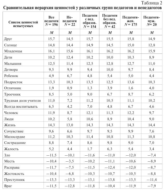В той же таблице 5 можно отметить, что занимающиеся педагогической деятельностью отличаются от непедагогов по трём из восьми нравственных категорий: первые более положительно оценивают такую черту, как «сочувствие», а также более негативно, чем непедагоги, оценивают такие черты, как «месть» и склонность к расправе. На характер пяти остальных нравственных установок фактор «педагогическая деятельность» достоверно не повлиял: и те, кто занимается педагогической деятельностью, и те, кто ею не занимается, одинаково оценивают и «милосердие», и «жестокость», и другие категории.