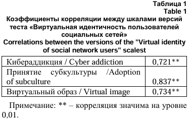 Таким образом, нами выявлены и описаны структурные компоненты виртуальной идентичности пользователей социальных сетей: «кибераддикция», «принятие субкультуры», «виртуальный образ». Обозначено, что виртуальная идентичность — это интегральный феномен, рассматриваемый нами как подсистема эго-идентичности, состоящая из текстовых, визуальных, аудиальных характеристик виртуального образа, отражающего физические и личностные свойства и особенности коммуникации, определяющие целостность и тождественность личности в рамках субкультуры пользователей социальных сетей. Эти данные служат подтверждением выводов, сделанных нами в более ранних публикациях [5, 15].