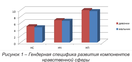 Также достоверные различия обнаружены в уровне развития нравственного сознания, где мальчики отстают от девочек (НС1 t=3,3, df=160, p меньше 0,01; НС2 t=2,8, df=160, p меньше 0,01; НС3 t=2,5, df=160, p меньше 0,01;). Отставание в развитии нравственных чувств и нравственного сознания, которые регулируют поведение ребенка-младшего школьника, не может не сказаться на уровне развития нравственного поведения мальчиков (НП1 t=2,9, df=160, p меньше 0,01; НП2 t=2,7, df=160, p меньше 0,01; НП3 t=3,1, df=160, p меньше 0,01;) и, соответственно, на общем уровне нравственного развития (t=2,8,df=160, p меньше 0,01) (рисунок 2).