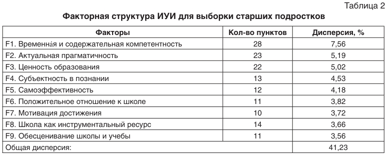 Структура учебного интереса старших подростков (10—11 классы) включает в себя 9 факторов, описывающих 41,23% общей дисперсии. В табл. 2 приведены количество пунктов и процент дисперсии, относящиеся к каждому из 9 факторов.
