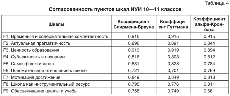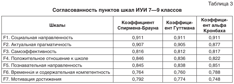 Проверка одномоментной надежности методом анализа согласованности ответов по каждой шкале проводилась с помощью расчета коэффициента альфа Кронбаха. Для оценки значимости коэффициента альфа Кронбаха применялся статистический критерий Китса [19]. В табл. 3 и 4 приводятся зна-чения коэффициентов альфа Кронбаха для каждой из шкал, входящих в структуру ИУИ 7—9 и 10—11 классов.
