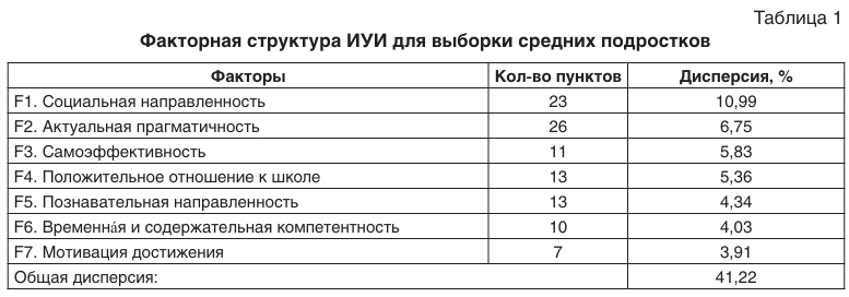 Основываясь на результатах факторного анализа для выборки средних подростков (7—9 классы), экспертами была выделена семифакторная модель Индекса учебного интереса, описывающая 41,22% общей дисперсии. В табл. 1 приведены количество пунктов опросника и процент дисперсии для каждого из семи факторов.