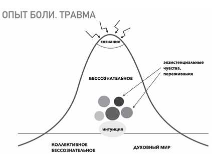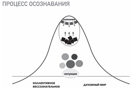 Начнем со схемы, которая отражает некую первичную целостность, а это, конечно, возможно лишь в раннем детстве, в котором нет расщепленности, разрыва между сознательным и бессознательным уровнями. Все чувства, переживания написаны на лице ребенка, он прозрачен для самого себя. Глубинная часть его психики, которую в полном смысле еще нельзя назвать бессознательным, открыта его сознанию. И вся эта целостная прозрачность соприкасается с тем, что Юнг называл коллективным бессознательным, мы же назовем это духовным миром. Соприкосновение происходит через то, что мы обычно называем интуицией. Можно предположить, что у ребенка это просто тотальная открытость, которая потом трансформируется в интуицию. Именно через интуицию человек, находящийся в прозрачности, улавливает тот тонкий мир, который является для верующего человека совершенно реальным. Это мир тонких энергий, мир духовных сущностей. Мир, в котором работают иные законы: время там может остановиться, ускориться, расшириться, обернуться вспять, исчезнуть. Пространство также может свернуться, сжаться, его можно перескочить, над ним можно воспарить и так далее. Здесь физика переходит в метафизику. Категории добра и зла обретают вполне реальные формы, при этом зло может принимать облик добра, и неискушенному в этом плане человеку довольно легко принять одно за другое. В духовной литературе это называется различением духов. Святые отцы учат остерегаться грубого проникновения в этот мир, поскольку несведущий человек не готов к такой встрече, это может быть крайне опасно как для его души, так и для его психики. Юнг описывал мир коллективного бессознательного как мир, порожденный и наполненный коллективной психической энергией. Правда, ему же принадлежит иная трактовка: коллективное бессознательное — это преисподняя, над которой возвышаются острова божественных архетипов. Верующему человеку вполне понятен такой образ. Психика не имеет прямых отношений с этим миром, с этой реальностью. Погружение в этот мир, постепенное познание его — это особый молитвенный путь, на котором новичка должен сопровождать опытный старец, молитвенник, проводник. Однако эта тема выходит за рамки психологии, потому вернемся в русло психологического рассмотрения и рассмотрим пространство, которое находится выше коллективного бессознательного. А выше все пока замечательно: еще нет никакого расщепления, раскола на сознательное и бессознательное. Верхние слои психики гармонично взаимодействуют с глубинными слоями, экзистенциальными чувствами и состояниями.