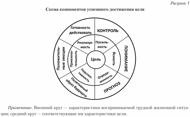 Системообразующим компонентом успешного копинга является цель. При этом для эффективного копинга важно учитывать правила хорошей цели. Во-первых, такая цель формулируется в позитивном ключе (без частицы «не»), как цель достижения (желаемого), а не избегания (неприятного). Во-вторых, хорошая цель предполагает ясную, конкретную, определенную формулировку с описанием критериев достижения, что позволяет ее реализовать (в противовес неясной, глобальной, имплицитной цели) (Дёрнер, 1997). «Сочетание труднодостижимости целей с их конкретностью — наилучший предиктор успешности деятельности субъекта» (Гордеева, 2006, с. 268).