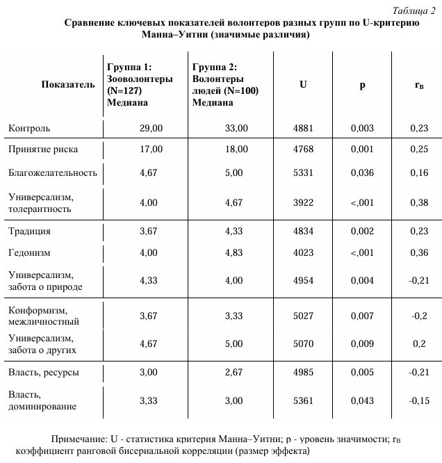 Анализ ценностных профилей обнаружил статистически значимые различия по ряду аспектов ценностной системы. По ценности «Благожелательность» (BED) зооволонтеры (M = 4,67, SD = 0,84) продемонстрировали значительно более низкие показатели в сравнении с волонтерами, помогающими людям (M = 5,01, SD = 0,61), U = 5331, p = 0,036, rB = 0,16. Наиболее выраженные различия выявлены по ценности «Универсализм: толерантность» (UNT): волонтеры людей обнаружили значительно более высокие значения (M = 4,67, SD = 0,63) в сравнении с зооволонтерами (M = 4,00, SD = 0,92), U = 3922, p < 0,001, rB = 0,38.