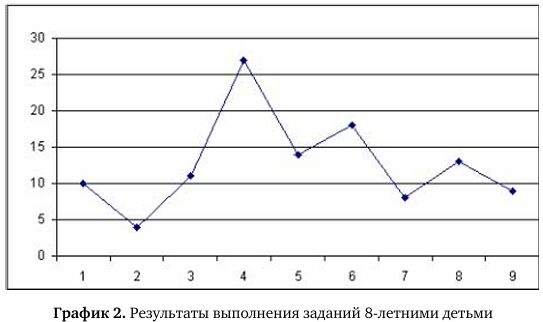 Проводя эксперименты с детьми младшего школьного возраста, мы обнаружили некоторые тенденции, принимающие характер определенной закономерности. Эксперименты проводились с детьми 5–6, 8 и 9 лет. В общей сложности нами исследованы три выборки испытуемых дошкольного и младшего школьного возраста. Объем отдельной выборки состоял из 50 испытуемых. Детям предлагалось 10 заданий на решение однотипных задач на обобщение. В каждом задании предъявлялось 20 геометрических фигур, 5 из которых имели общие признаки, а оставшиеся 15 выступали в качестве «фоновых». Время, за которое ребенку предлагалось отыскать фигуры, подлежащие объединению, и произвести соответствующее обобщение, фиксировалось. Напомним, что предлагаемые задачи были однотипными, т.е. если в одной серии ребенок производил обобщение с треугольниками, то в другой — с квадратами или ромбами. При изменении последовательности предъявления заданий мы обнаружили неизменность результатов по фиксируемому времени выполнения, что подтверждает однотипность задач эксперимента.
