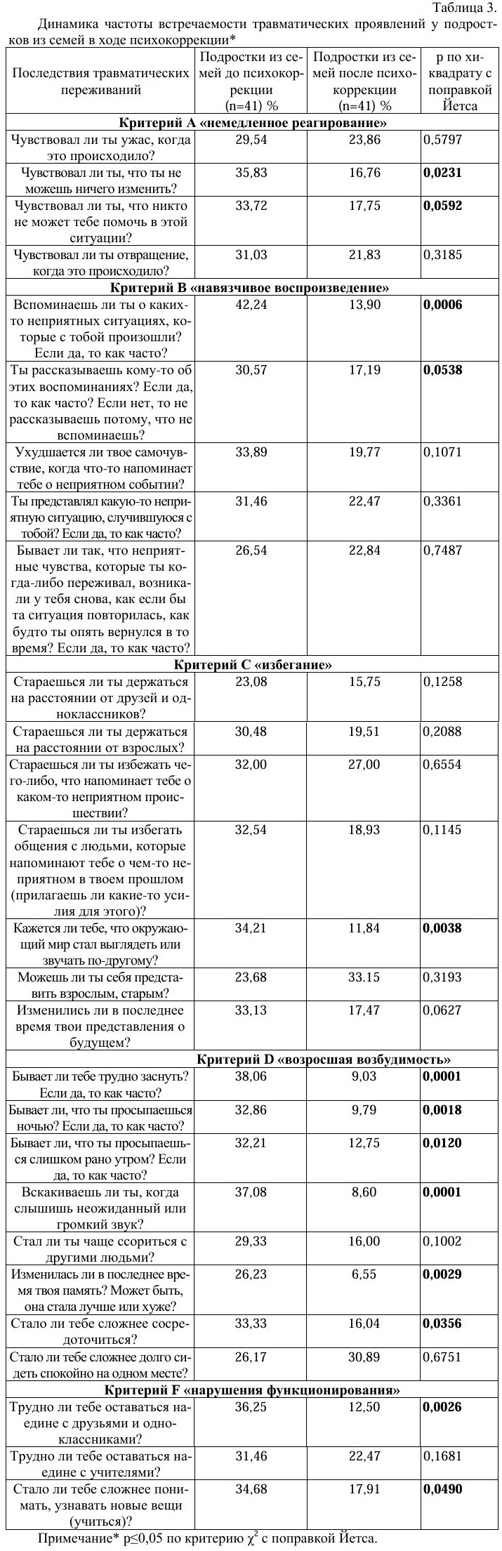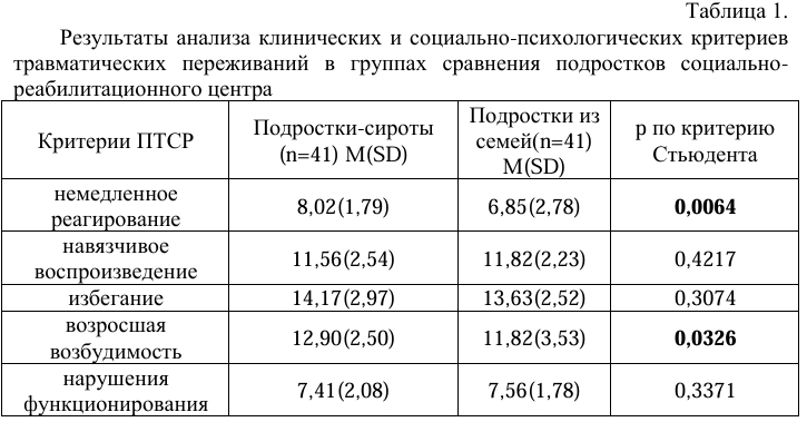 В результаты проведенного сравнительного анализа у подростков из семей выявлены статистически значимые различия по общим баллам следующих критериев: «немедленное реагирование» (p=0,0369); «избегание» (p=0,0043); «возросшая возбудимость» (p=0,0000) и «нарушение функционирования» (p=0,0504). По критерию «навязчивое воспроизведение» статистических различий в частоте встречаемости травматических переживаний не выявлено (p=0,6671), несмотря на то что статистически реже стали отмечаться жалобы навязчивого характера о травматических событиях.