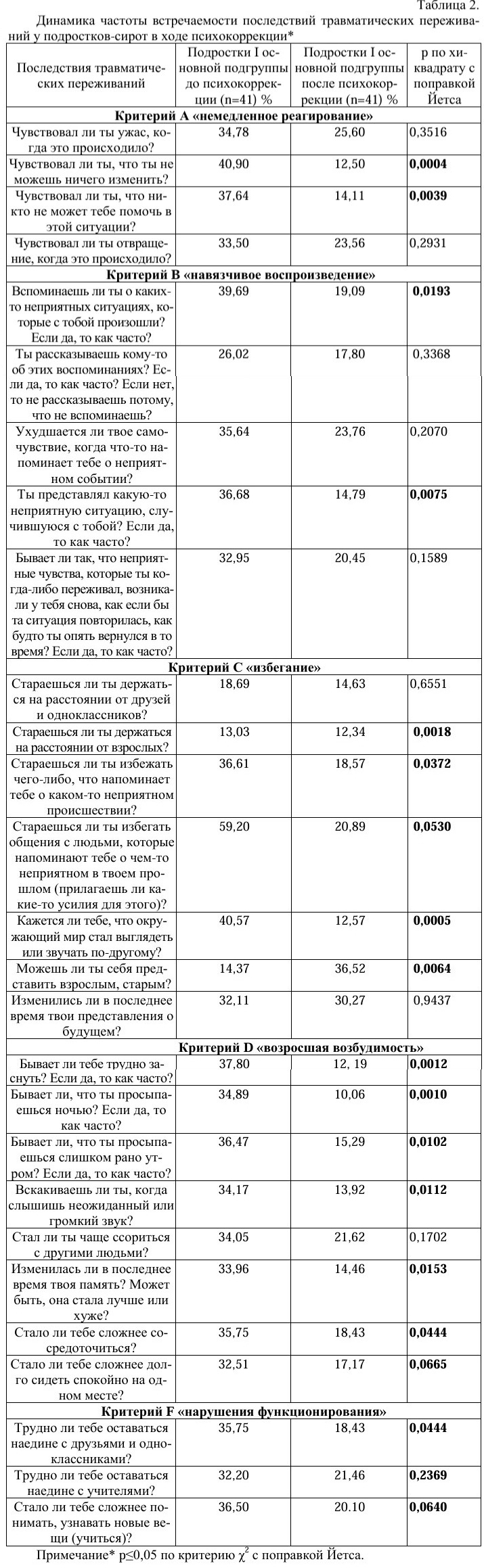 Результаты анализа частоты встречаемости травматических переживаний у подростков-сирот до и после психокоррекции представлены в табл. 2.