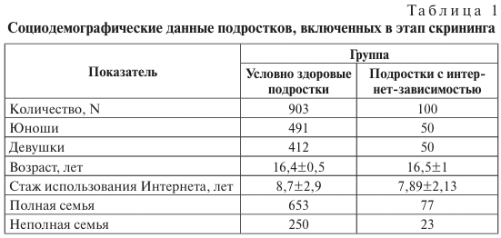 Выборка составила 1003 подростка, учащихся старших классов средних общеобразовательных школ и лицеев г. Москвы, средний возраст — 16,4 года; группы эквивалентны по гендерному составу, социодемографическим характеристикам. На этапе скрининга с помощью шкалы интернет-зависимости Чен (CIAS) [3] и полуструктурированного интервью выделена группа подростков с наличием сформированной интернет-аддикции (n=100), у остальных подростков не выявлено интернет-зависимости (табл. 1). Деятельность подростков в интернет-сети носила смешанный характер: онлайн-игры и сервисы онлайн-общения. В контрольную группу (n=150), по результатам полуструктурированного интервью, вошли подростки с минимальным риском развития интернет-зависимости, имеющие дополнительные хобби и увлечения, социально активные.