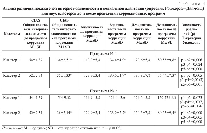 Спустя 2 недели после проведения программ коррекции при повторном тестировании (по данным методик «Шкала интернет-зависимости» Чен и Роджерса—Даймонд) было выявлено, что для кластера 2 (группа подростков с преобладанием акцентуаций и снижением эмоционального интеллекта) одинаково эффективны обе программы. Тогда как для группы с нейропсихологическими нарушениями программа № 2 оказалась менее эффективной. Результаты сравнительного анализа представлены в табл. 4.