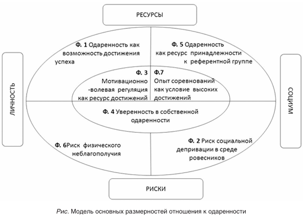 В целом можно отметить, что выделенные факторы позволяют сконструировать гипотетическую модель, наглядно представляющую и иллюстрирующую полученные результаты, и выделить основные размерности отношения к одаренности: ресурсы — риски одаренности (факторы 1, 2, 6 и 7); внутренние — внешние условия высоких достижений (факторы 3 и 5); личность — социум как основная среда проявления рисков и ресурсов одаренности (факторы 1—5 и 7), а также включают генерализованную оценку собственной одаренности (фактор 4), что схематично представлено на рисунке.
