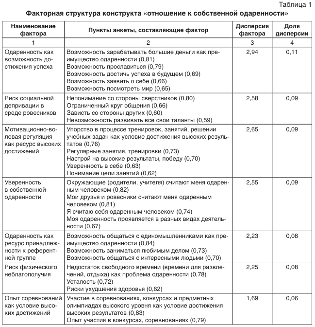 В результате факторизации данных анкеты было выделено семь факторов, описывающих основные элементы понятия «отношение к собственной одаренности» (см. табл. 1). Корректность факторного решения оценивалась по результатам теста КМО (КМО=0,815).