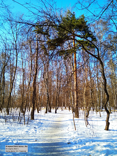 Первый день весны 2022 г. По пути на работу прохожу скорым шагом (спешу, уже опаздываю) через край Кузьминского леса. Этот маршрут — не совсем мне по пути к месту работы, но уж очень… по душе. Очень хочется навестить любимый «островок» природы в городе. Буквально залитый сегодня солнечным светом (рис. 23). Природа просыпается.
