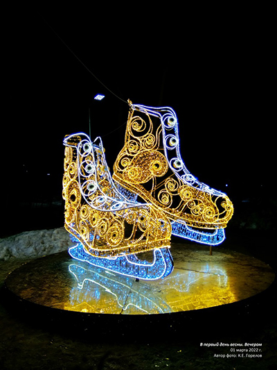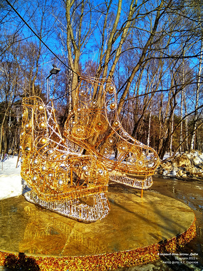 А вот и «Коньки» (световая фигура‑инсталляция). Всё ещё стоят здесь, со времени празднования Нового Года. Теперь, первым мартовским днём, на ярком солнце, с весенними лужами вокруг, — они выглядят немного сиротливо и виновато… Будто просят: «Заберите уже нас отсюда поскорее, до следующей зимы, до скрипучего снега и крепких морозов…»
