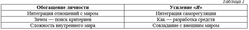 Можно условно выделить две взаимодополняющие стороны личностного развития, усиление «Я» и обогащение личности. Первая связана с выстраиванием саморегуляции и самодетерминации активности, превращения личности в автономного субъекта собственной жизнедеятельности и саморазвития. Вторая характеризует развитие и усложнение внутреннего мира, рост понимания и охвата реальности, обретение мудрости.