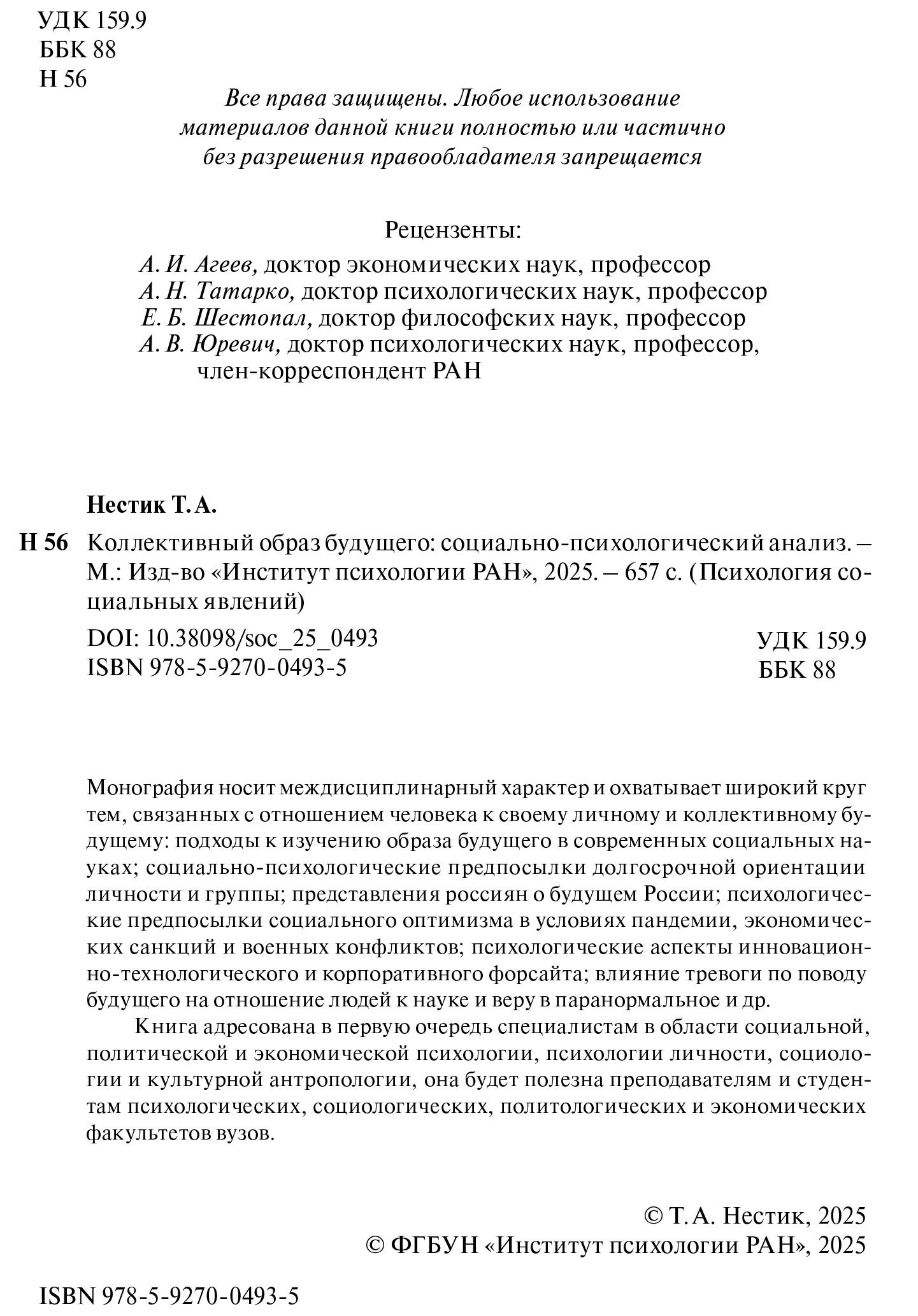 Разработана социально-психологическая концепция коллективного образа будущего, предложен инструментарий для поддержки его конструирования в малых и больших социальных группах. На основе результатов серии многочисленных исследований, охвативших в общей сложности более чем 50 тысяч россиян, выявлены психологические механизмы, лежащие в основе готовности разных поколений россиян к конструированию образа будущего России и сохранения социального оптимизма даже в кризисных условиях. Предложены методы ослабления когнитивных искажений, затрудняющих социальное прогнозирование в ходе корпоративных и отраслевых форсайтов. Впервые выделены закономерности конструирования коллективного образа будущего в условиях геополитического противостояния, военных конфликтов и угрозы применения ядерного оружия. Сделан вывод о том, что поддержка позитивного образа будущего России должна опираться на признание реальных, а не символических угроз для развития страны; а также на поддержку позитивного осмысления полученного трагического коллективного опыта как основания для достижения амбициозных созидательных коллективных целей и дальнейшего развития нашей страны. Разработана методология диагностики и поддержки долгосрочной ориентации личности и группы. Впервые показано, что в условиях неопределенности снижение ориентации на планирование может компенсироваться ростом интереса к будущему, ориентацией на традиции и непрерывное развитие. Предложены рекомендации по поддержке социального воображения, коллективного целеполагания и социального оптимизма в России.