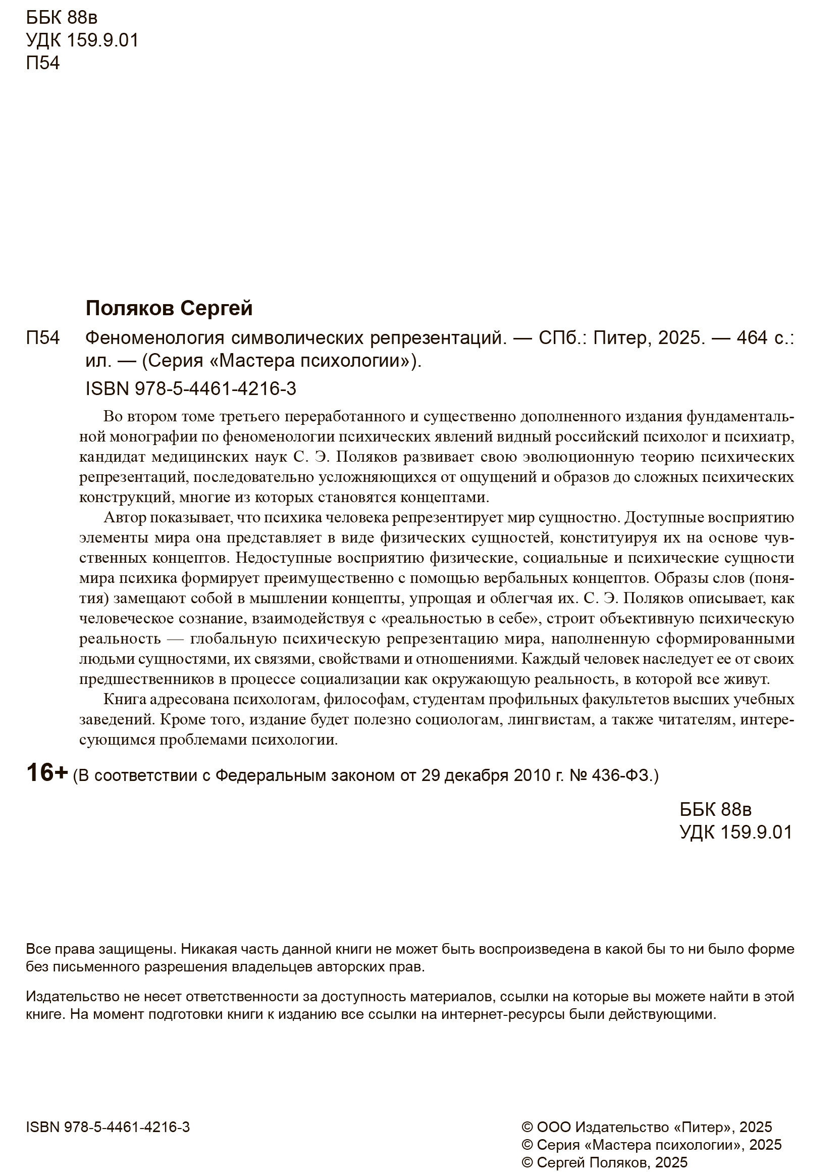 Книга исследует, как сознание конституирует реальность в форме психических конструкций: от чувственных образов к понятиям и категориям, от «фактов» к социальной действительности и, наконец, к особой области — объективной психической реальности (ОПР). Автор возвращает психологию к её подлинному предмету — феноменологии психических репрезентаций.