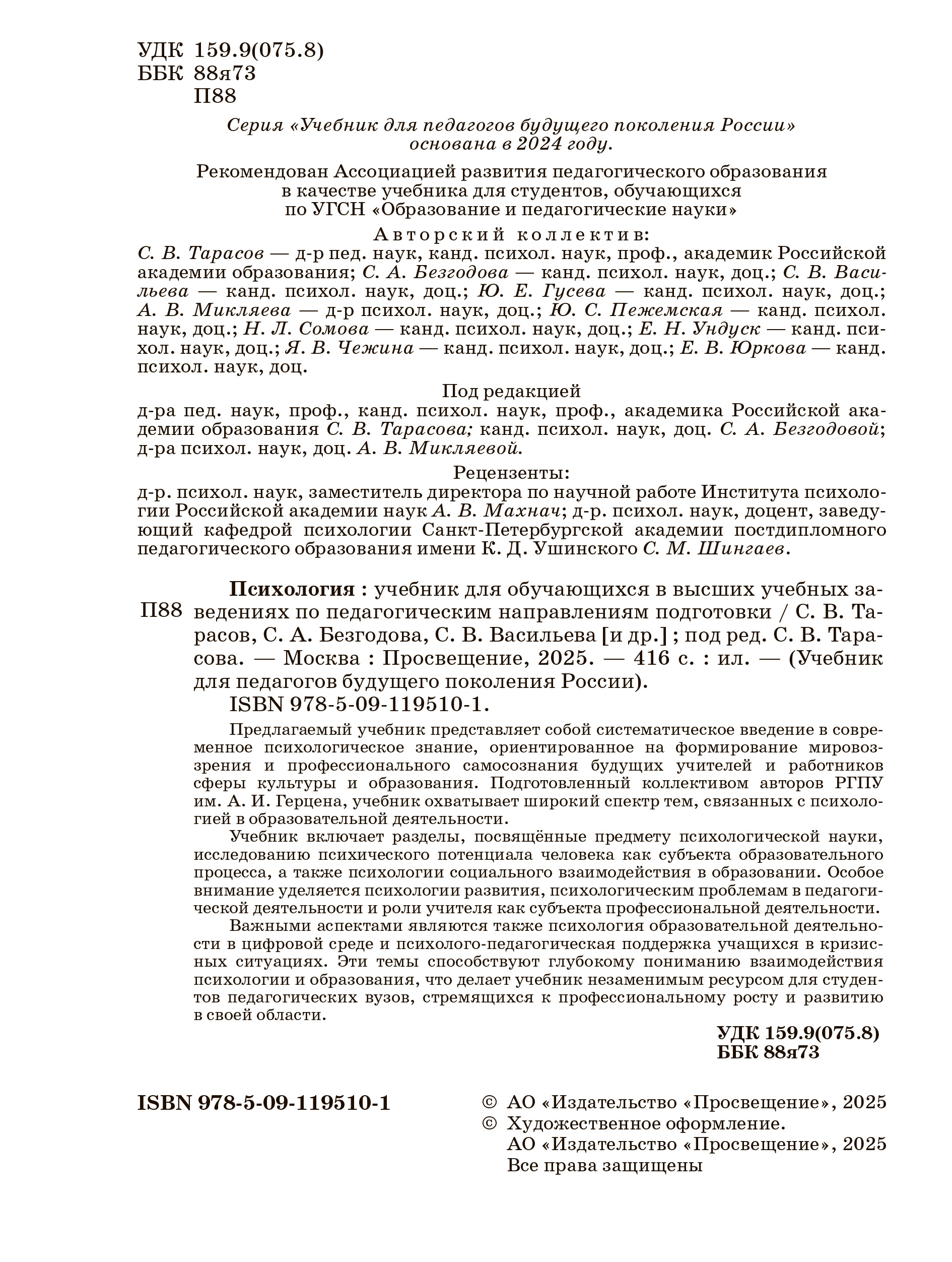 Учебник подготовлен для студентов, обучающихся по педагогическим специальностям, и содержательно соответствует программам дисциплин «Ядра педагогического образования». Первые четыре раздела (Введение в психологию; Психический потенциал человека как субъекта образовательной деятельности; Психология социального взаимодействия в образовании; Психология развития человека в образовании) традиционны для психологической подготовки учителя и являются теоретико-прикладными. Остальные разделы связаны с профессиональным становлением самого педагога, его умением реагировать на изменения в системе образования, формированием приемов работы в различных ситуациях, к примеру: ведения педагогической деятельности в условиях интеграции и инклюзии, цифровизации, обучения одаренных детей, проведения профилактики девиантного поведения.