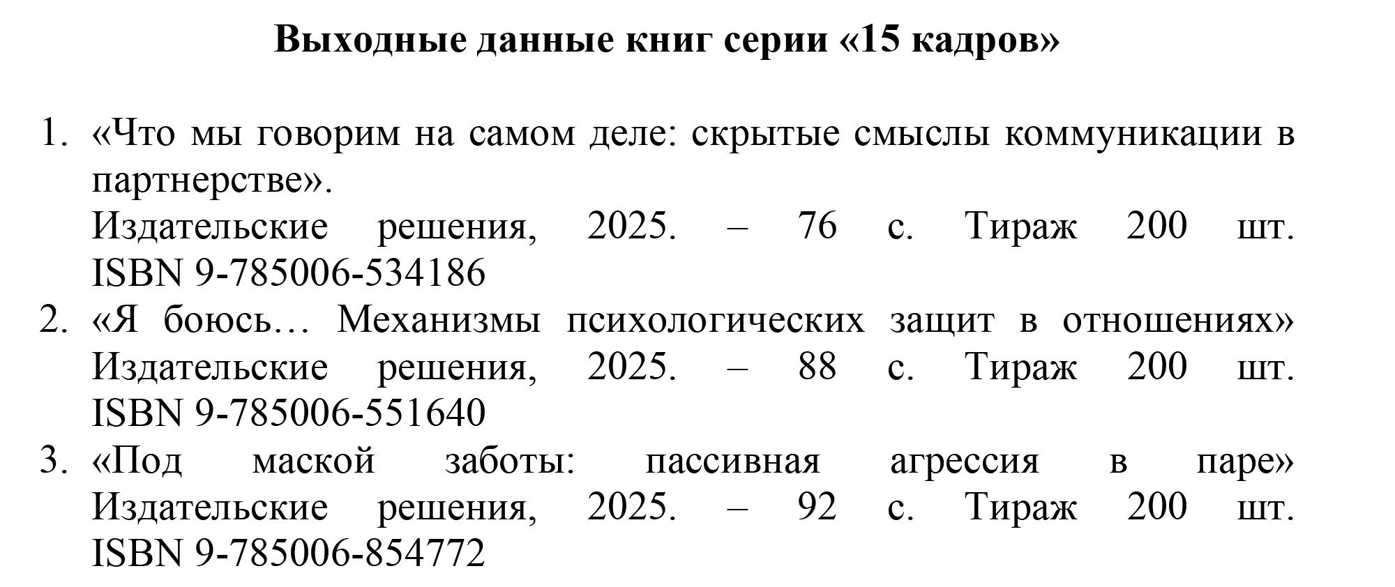 На данный момент в серии «15 кадров» вышло 3 книги (1-я – в январе, последняя – в декабре 2025г.). Книга «Что мы говорим на самом деле» посвящена теме близости и искренности в паре. На примерах кадров из фильма «Возлюбленные» в ней показывается, как близость проявляется в конкретных ситуациях, возникающих в отношениях, а особенно в ситуациях конфликта или непонимания. В ней освещаются «скрытые транзакции» (Э. Берн), «родительские предписания» (М. и. Р. Гулдинг), исследуются глубинные смыслы коммуникации между партнерами.
