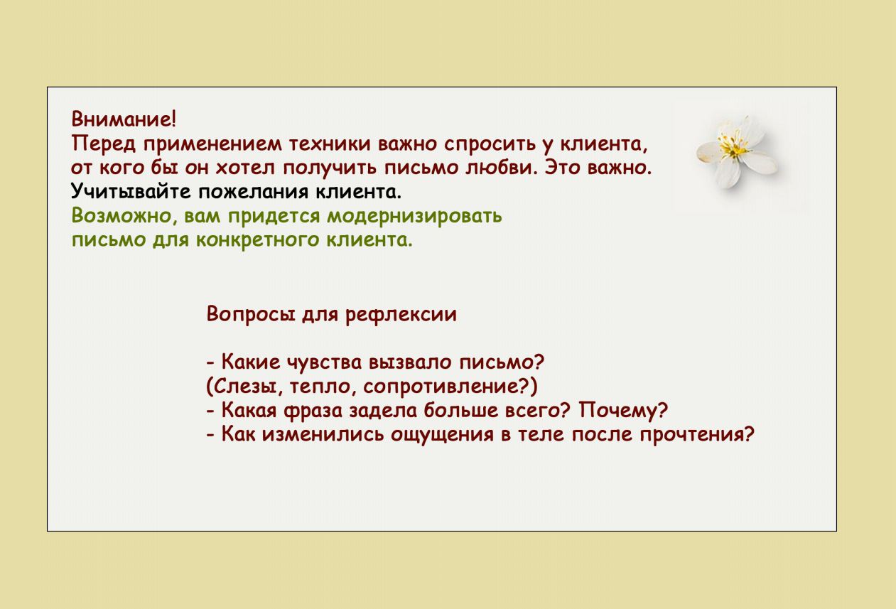 Это инновационная авторская разработка, готовая технология, которая позволяет психологам эффективно работать с психосоматикой, непринятием себя, низкой самооценкой и выгоранием.