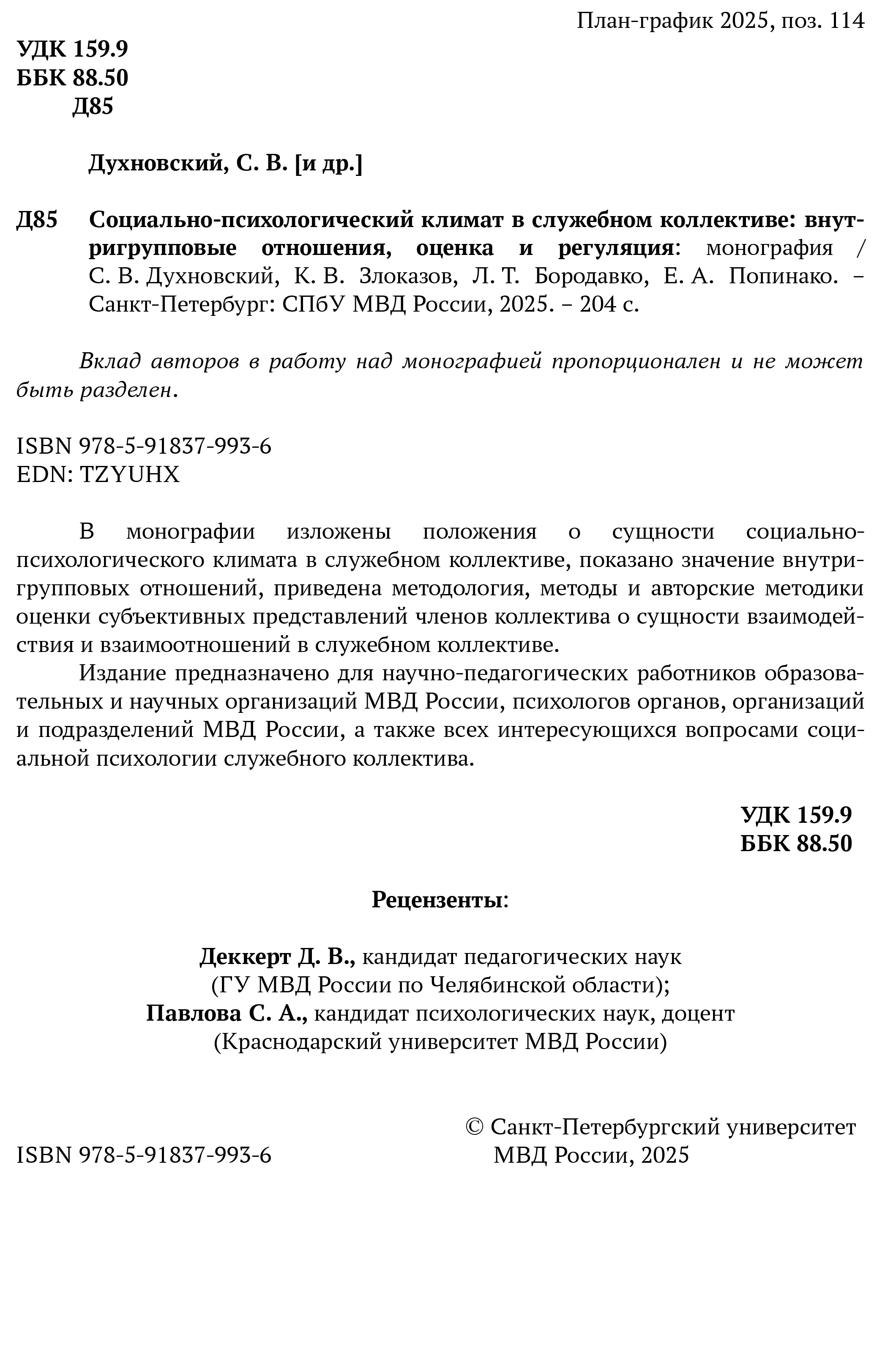 Научно-методическая актуальность работы обусловлена важностью совершенствования методов изучения социально-психологического климата в служебных коллективах органов внутренних дел Российской Федерации, в том числе, разработки его научных основ и методических компонент. Учитывая высокую значимость изучения социально-психологического климата, важным представляется расширение и уточнение теоретических оснований его исследований. Данное действие должно опираться на существующий опыт и теоретические представления отечественных и зарубежных ученых о служебных коллективах и взаимоотношениях их членов. В рамках монографии данная задача решается путем анализа и обобщения представлений о теориях функциональных отношений членов служебного коллектива и разработки новой концепции социально-психологического климата.