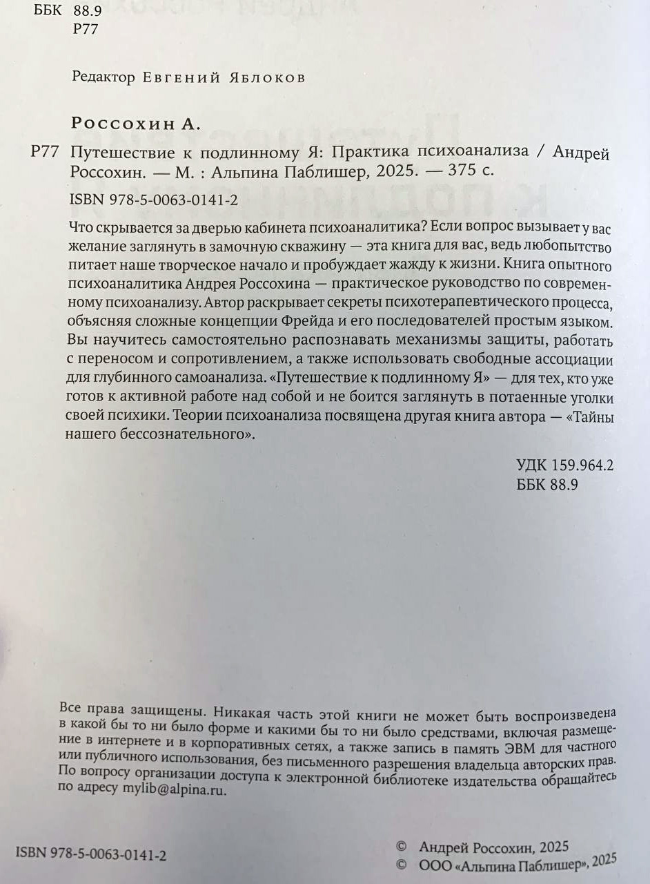 В свою очередь книга «Путешествие к подлинному Я. Практика психоанализа» приоткрывает «дверь кабинета психоаналитика», предлагая детальное практическое руководство по процессу терапии. Автор объясняет механизмы защиты, принципы работы с переносом и сопротивлением, а также методику использования свободных ассоциаций для глубинного самоанализа. Примечательно, что «в психоанализе мы не боремся с сопротивлением», но помогаем клиенту осознать его связь с прошлым. Автор отмечает, что основная задача психоанализа — помочь пациенту «обрести психоаналитическое Я, которое и после завершения анализа сможет переосмысливать текущие "мифы" о самом себе и открывать новое». Результатом успешного анализа становится обретение сил пациентом «самостоятельно решать свои проблемы, принимать новые вызовы, вытаскивать себя из бед, прорабатывать конфликты, открываться эмоциям и ставить перед собой новые задачи».
