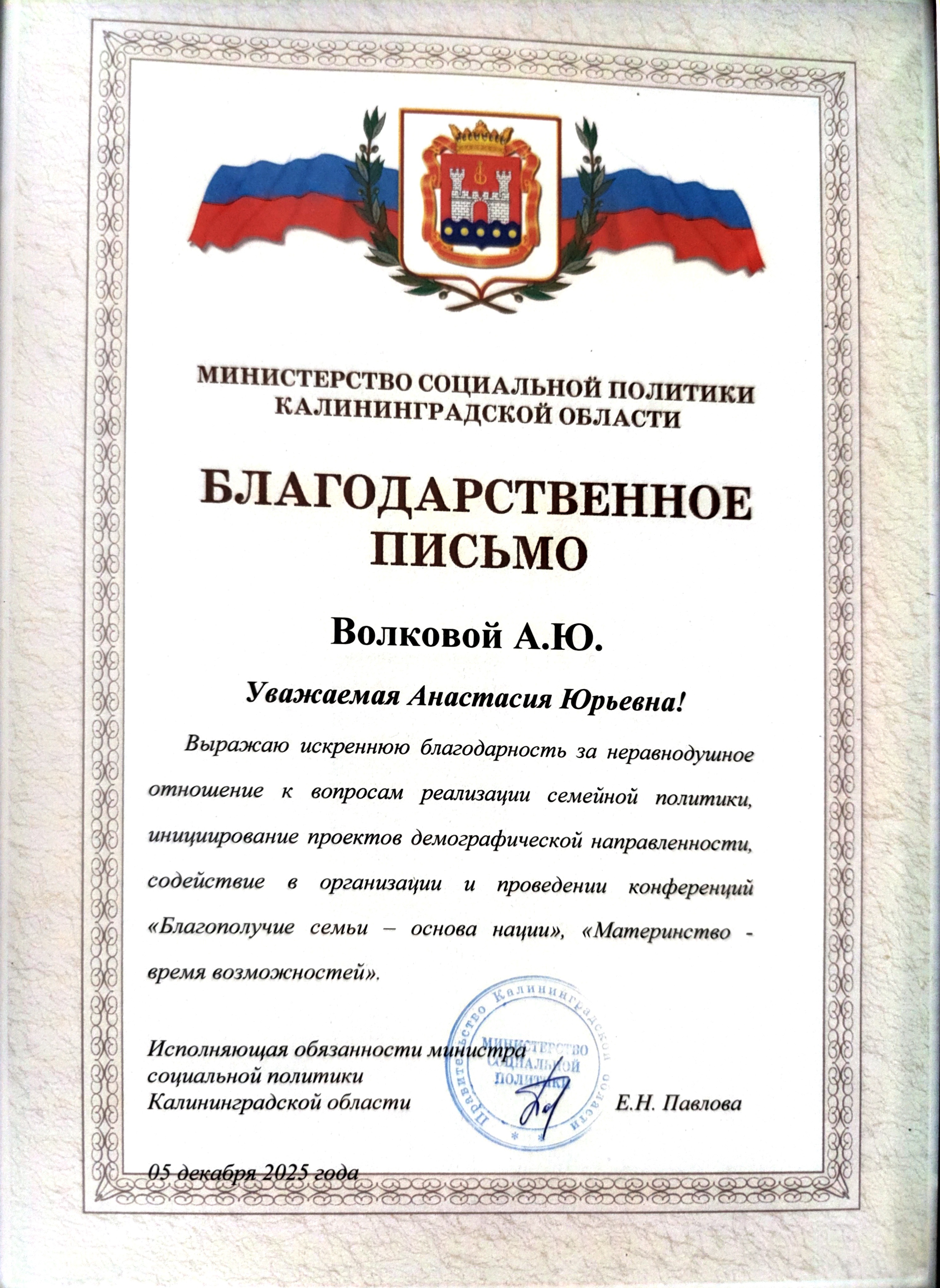 В рамках проекта в 2025 году были проведены две конференции: «Благополучие семьи — основа нации» (18.09.2025) и «Материнство — время возможностей» (24.11.2025), реализованные в партнёрстве с Министерством социальной политики Калининградской области, Российским обществом «Знание», платформой «Добро.рф» и Центром психологической поддержки Анастасии Волковой.