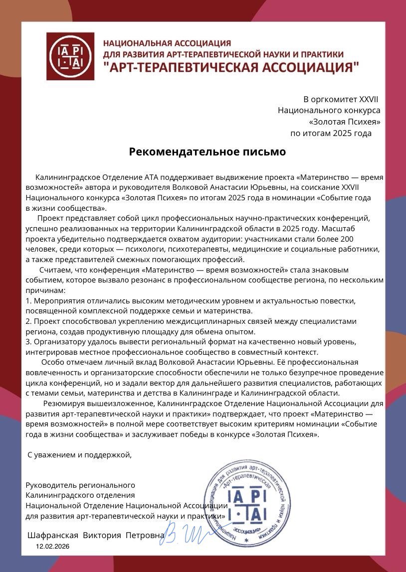 Проект представляет собой региональную серию профессиональных конференций, посвящённых психологическому благополучию семьи, материнства и детства, реализованную в 2025 году в Калининградской области. Ключевым событием проекта стала конференция «Материнство — время возможностей».