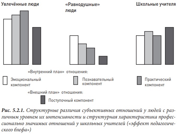У увлечённых людей все компоненты отношения имеют высокие показатели, причём практический компонент занимает первое место, а поступочный, как самый «трудный», характеризуется более низким уровнем. У людей, равнодушных к данному объекту, естественно, все компоненты имеют низкие значения, причём доминирует эмоциональный компонент, а поступочный выражен минимально. А вот для учителей оказалось типично рассогласование между относительно низкими уровнями показателей эмоционального, познавательного и практического компонентов, с одной стороны, и высоким показателем поступочного — с другой. Это явление, связанное с низкой внутренней согласованностью профессионально значимых отношений учителей, и было названо «эффектом педагогического блефа» (рис. 5.2.1).