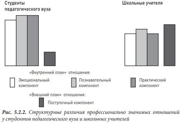 Показатели уровней всех «внутренних» компонентов этих отношений у учителей ниже, чем у студентов соответствующих педагогических специальностей. При этом характерно, что у студентов очень низок уровень поступочного компонента профессионально значимых отношений, поскольку их деятельность, связанная с объектами этих отношений, направлена прежде всего «вовнутрь», на собственное развитие, удовлетворение своих интересов.