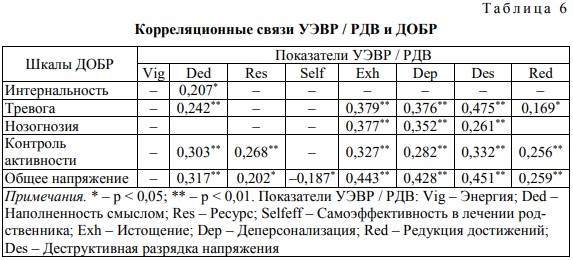 Полученные по ретесту данные свидетельствуют о достаточной устойчивости шкал опросника к случайным временным изменениям, т.е. говорят о хорошей надежности шкал методики УЭВР / РДВ. Относительно невысокую устойчивость продемонстрировали шкалы «Энергия», «Наполненность смыслом» и «Ресурс», что может отражать чувствительность ресурсной составляющей личностного функционирования родственника к изменениям ситуации лечения, в частности изменению формы оказываемой помощи (стационарная / амбулаторная).