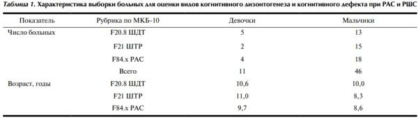 Клинико-психологическая квалификация видов когнитивного дизонтогенеза позволяет получить необходимые данные и показать особенности возрастной динамики, дать характеристику специфичности когнитивных нарушений у больных с РАС и РШС с учетом ряда параметров (клинических, половозрастных). Данный комплексный подход патопсихологического обследования больных позволяет отслеживать динамику состояния пациентов, определять нормативность-специфичность их психического развития (в отношении тестируемых психических процессов когнитивного развития) на разных этапах течения болезни.