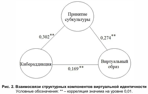 На следующем этапе проверялась гипотеза об интегральной сущности феномена виртуальной идентичности. В исследовании приняли участие 285 человек от 18 до 72 лет (197 женщин, 88 мужчин). Гипотеза получила эмпирическое подтверждение. Оказалось, что структурные компоненты виртуальной идентичности коррелируют между собой. Корреляционная структура виртуальной идентичности представлена на рис. 2.