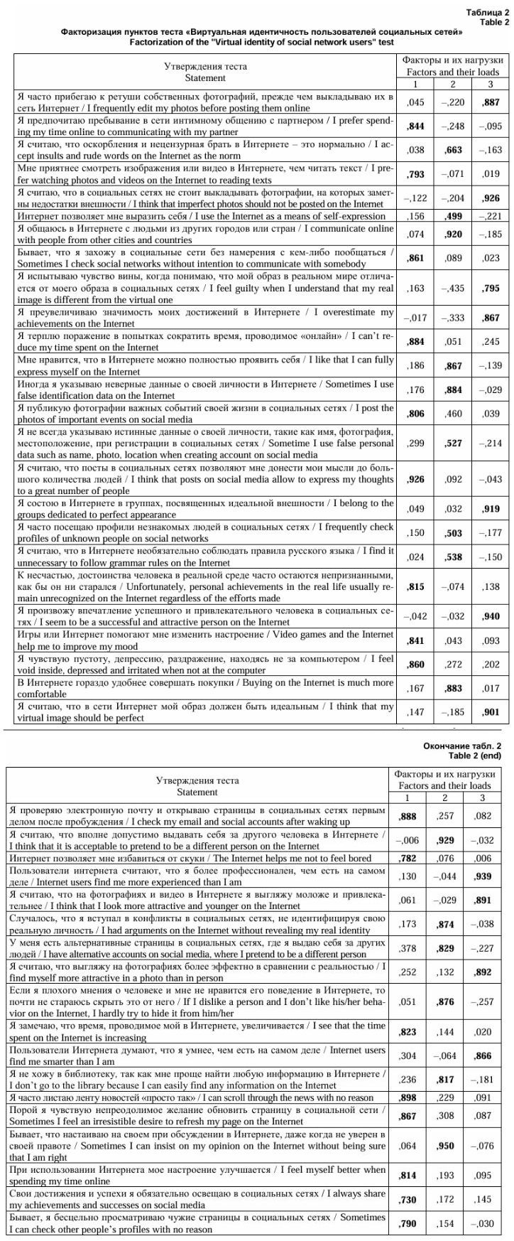 В ходе повторной процедуры факторного анализа было установлено, что все вопросы вносят наибольшие вклады в соответствующие факторы и наименьшие в остальные, т. е. можно говорить о достаточной надежности полученного факторного решения, включающего три компонента виртуальной идентичности (табл. 2).