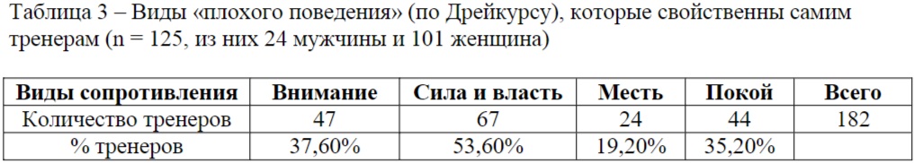 В некоторых мастер-классах я задавала тренерам вопрос: «Какой вид сопротивления свойственен вам самим?» Оказалось, что в той или иной степени тренеры признают у себя все виды сопротивления, хотя и с разной частотой (таблица 3).