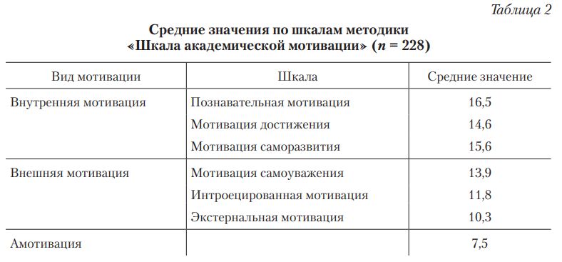 Данные об уровне мотивации студентов представлены в табл. 2.