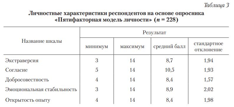 Для выявления личностных характеристик респондентов был использован краткий опросник пятифакторной модели личности (табл. 3).