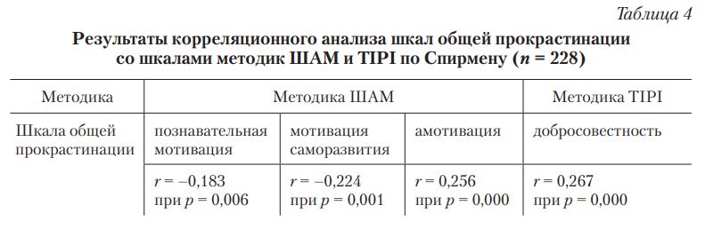 Если связи прокрастинации со шкалами мотивации ожидаемы и понятны, то взаимосвязь прокрастинации с добросовестностью нуждается в обсуждении. Получается, что добросовестные студенты более склонны откладывать дела на потом. Возможно, они ищут более подходящий момент для того, чтобы сделать задание качественно. С другой стороны, это может говорить о том, что студенты испытывают большую учебную нагрузку и вынуждены откладывать какие-то учебные задания, так как не имеют возможности выполнить их добросовестно, а формально выполнять не желают. Это заставляет задуматься о расчетах учебной нагрузки студентов и об уменьшении числа заданий при повышении их сложности, возможно, междисциплинарности, а также качестве проверки этих заданий с адресной выдачей обратной связи.