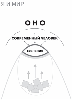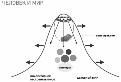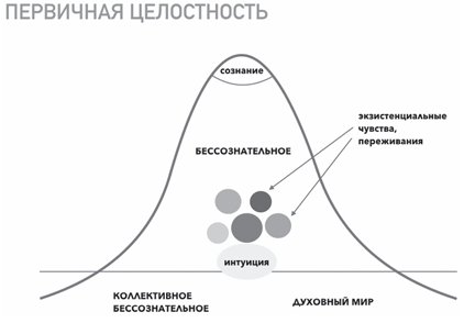 Начнем со схемы, которая отражает некую первичную целостность, а это, конечно, возможно лишь в раннем детстве, в котором нет расщепленности, разрыва между сознательным и бессознательным уровнями. Все чувства, переживания написаны на лице ребенка, он прозрачен для самого себя. Глубинная часть его психики, которую в полном смысле еще нельзя назвать бессознательным, открыта его сознанию. И вся эта целостная прозрачность соприкасается с тем, что Юнг называл коллективным бессознательным, мы же назовем это духовным миром. Соприкосновение происходит через то, что мы обычно называем интуицией. Можно предположить, что у ребенка это просто тотальная открытость, которая потом трансформируется в интуицию. Именно через интуицию человек, находящийся в прозрачности, улавливает тот тонкий мир, который является для верующего человека совершенно реальным. Это мир тонких энергий, мир духовных сущностей. Мир, в котором работают иные законы: время там может остановиться, ускориться, расшириться, обернуться вспять, исчезнуть. Пространство также может свернуться, сжаться, его можно перескочить, над ним можно воспарить и так далее. Здесь физика переходит в метафизику. Категории добра и зла обретают вполне реальные формы, при этом зло может принимать облик добра, и неискушенному в этом плане человеку довольно легко принять одно за другое. В духовной литературе это называется различением духов. Святые отцы учат остерегаться грубого проникновения в этот мир, поскольку несведущий человек не готов к такой встрече, это может быть крайне опасно как для его души, так и для его психики. Юнг описывал мир коллективного бессознательного как мир, порожденный и наполненный коллективной психической энергией. Правда, ему же принадлежит иная трактовка: коллективное бессознательное — это преисподняя, над которой возвышаются острова божественных архетипов. Верующему человеку вполне понятен такой образ. Психика не имеет прямых отношений с этим миром, с этой реальностью. Погружение в этот мир, постепенное познание его — это особый молитвенный путь, на котором новичка должен сопровождать опытный старец, молитвенник, проводник. Однако эта тема выходит за рамки психологии, потому вернемся в русло психологического рассмотрения и рассмотрим пространство, которое находится выше коллективного бессознательного. А выше все пока замечательно: еще нет никакого расщепления, раскола на сознательное и бессознательное. Верхние слои психики гармонично взаимодействуют с глубинными слоями, экзистенциальными чувствами и состояниями.