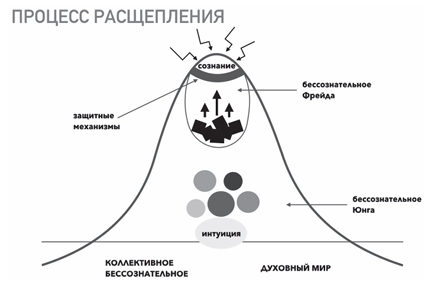 Итак, для того чтобы удерживать вытесненные переживания вне сознания, психика создает мощный пласт защитных механизмов, запирающих травматический опыт в бессознательном. Фрейд наиболее точно описал этот механизм, потому назовем эту часть внутреннего пространства «бессознательным по Фрейду». И воспользуемся именем Юнга, обозначая другую часть бессознательного, которая лежит глубже, наполнена глубокими переживаниями, экзистенциальными состояниями, способностью к трансцендированию. Эта часть бессознательного соприкасается с коллективным бессознательным через интуицию. Итак, мы видим картину того самого расщепления психики, которое является фундаментом многих будущих психологических проблем. Это расщепление лежит в основе искаженного восприятия, поскольку нарушается целостность, человек теряет связь между чувством, мышлением и действием. Утрачивается связь с реальностью подлинных переживаний. Человек погружается в мир кривых зеркал, ложных объяснений, ложных оправданий. Отсюда вырастают впоследствии различные формы невротических расстройств, невротической религиозности, социального конформизма и многих других психологических проблем.