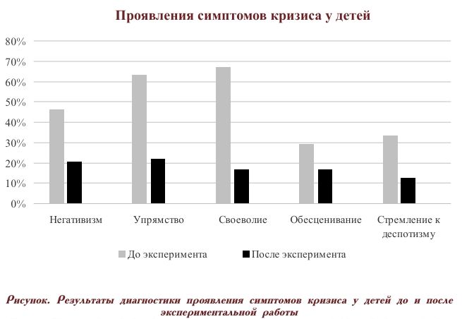 Контрольный этап исследования показал выраженную положительную динамику изменений в проявлениях кризиса трех лет во всех группах. Общее число детей, у которых наблюдались симптомы кризиса, снизилось до 29%, среди них своеволие диагностировано у 16,6%, упрямство — у 29,1, негативизм — у 20,8, стремление к деспотизму — у 12,5, обесценивание — у 16,6%. Результаты показывают, что число детей со своеволием сократилось в 4 раза, с упрямством — в 2,1, негативизмом — в 2,2, стремлением к деспотизму — в 2,6, обесцениванием — в 1,6 раза (рисунок).