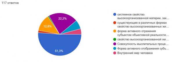 Большинство участников (51,3%) считает, что психика — это системное свойство высокоорганизованной материи, заключающееся в активном отражении субъектом объективного мира, в построении им неотчуждаемой от него картины этого мира и саморегуляции на этой основе своего поведения и деятельности (Психология: слов. / под ред. А. В. Петровского. М., 1990).