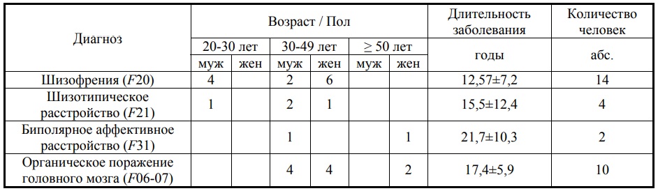 Распределение пациентов экспериментальной группы по нозологическим группам, полу, возрасту, и длительности заболевания представлено в таблице. За исключением одного больного с шизотипическим расстройством, с длительностью заболевания — 2 года, все остальные пациенты имели 2 группу инвалидности по психическому заболеванию (табл. 1).